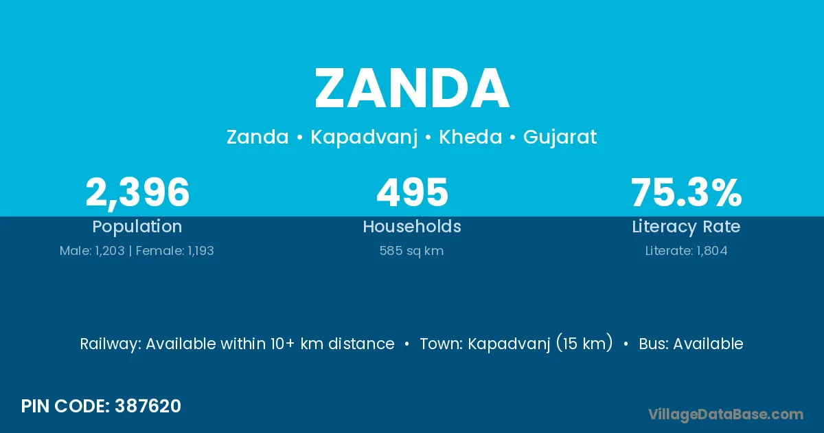 Kapadvanj (15 km) is the nearest town to Zanda village for major economic activities and is located approximately 15 km away.