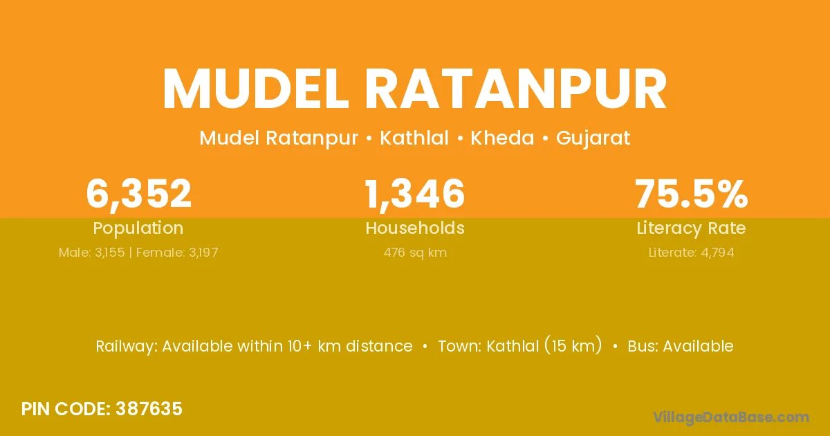 Kathlal (15 km) is the nearest town to Mudel Ratanpur village for major economic activities and is located approximately 15 km away.