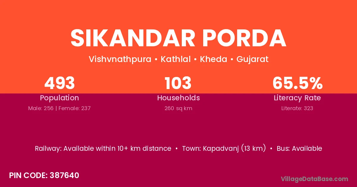 Kapadvanj (13 km) is the nearest town to Sikandar Porda village for major economic activities and is located approximately 13 km away.