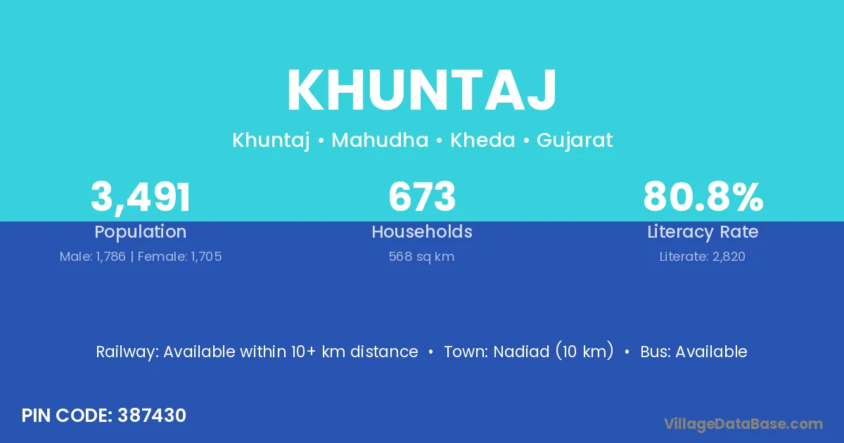 Nadiad (10 km) is the nearest town to Khuntaj village for major economic activities and is located approximately 10 km away.