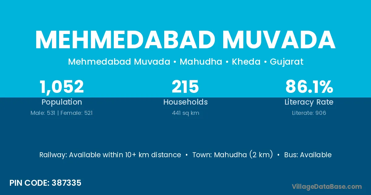 Mahudha (2 km) is the nearest town to Mehmedabad Muvada village for major economic activities and is located approximately 2 km away.
