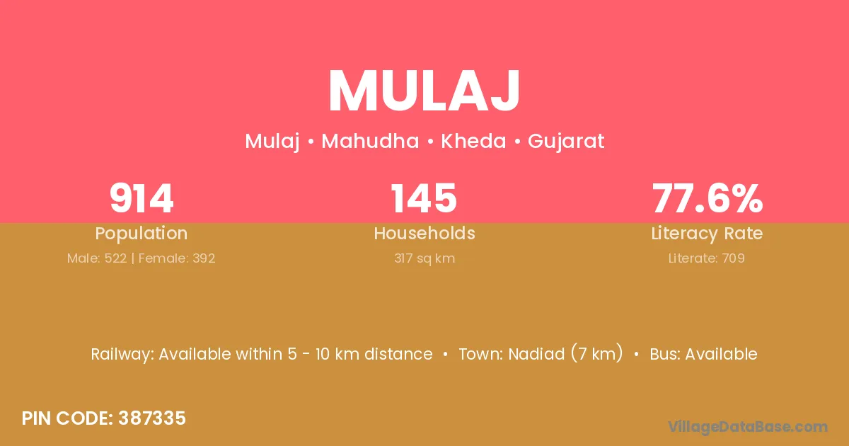 Nadiad (7 km) is the nearest town to Mulaj village for major economic activities and is located approximately 7 km away.