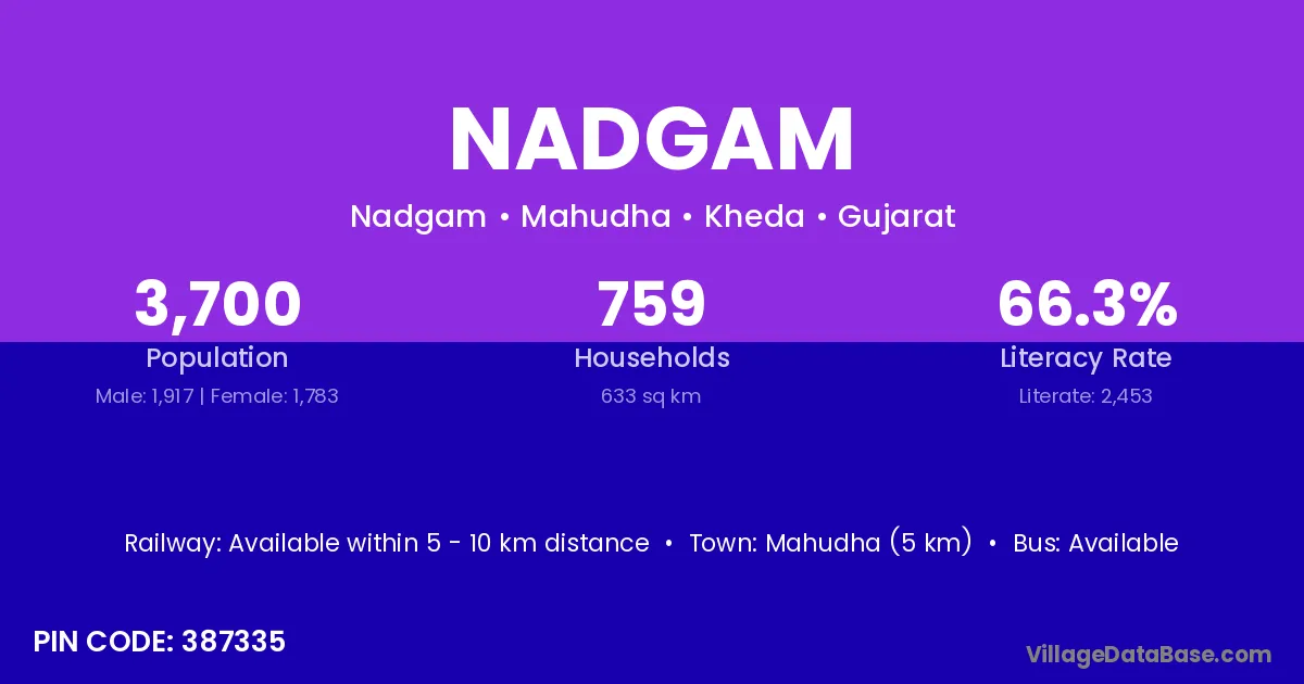 Mahudha (5 km) is the nearest town to Nadgam village for major economic activities and is located approximately 5 km away.