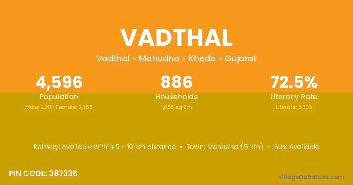 Mahudha (5 km) is the nearest town to Vadthal village for major economic activities and is located approximately 5 km away.