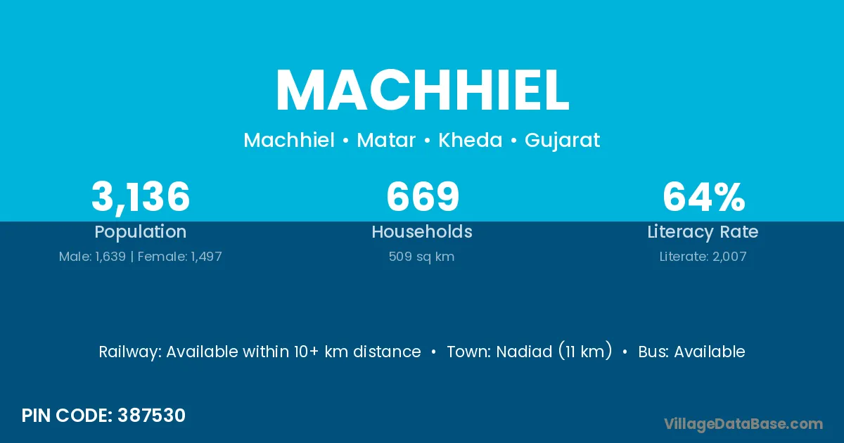 Nadiad (11 km) is the nearest town to Machhiel village for major economic activities and is located approximately 11 km away.