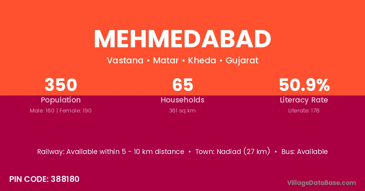 Nadiad (27 km) is the nearest town to Mehmedabad village for major economic activities and is located approximately 27 km away.