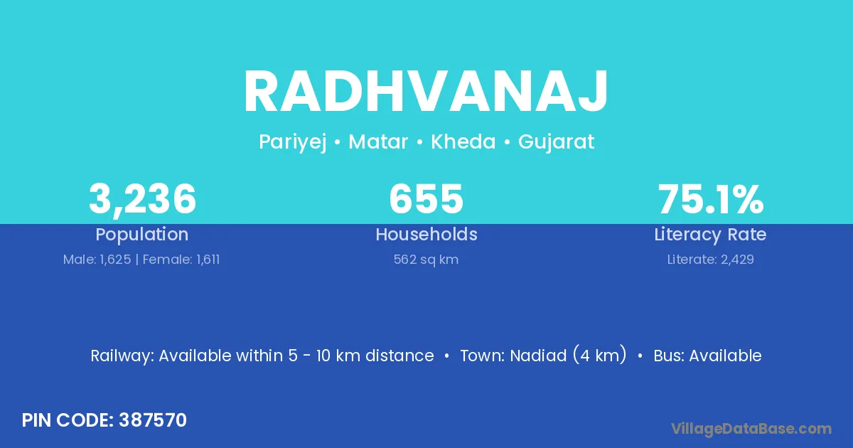 Nadiad (4 km) is the nearest town to Radhvanaj village for major economic activities and is located approximately 4 km away.