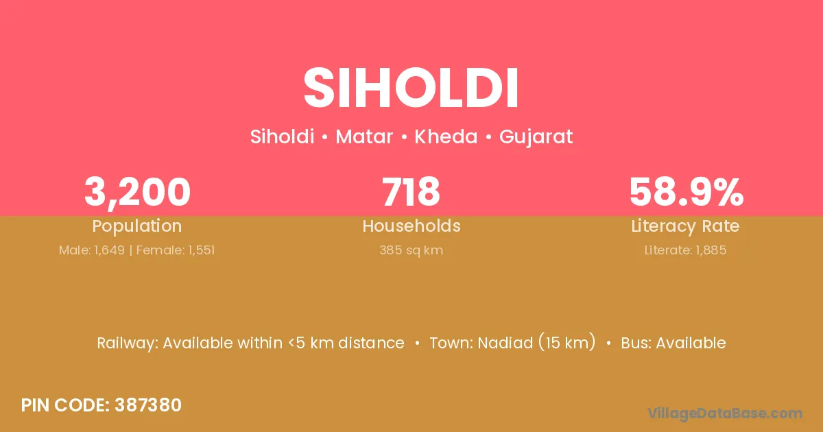 Nadiad (15 km) is the nearest town to Siholdi village for major economic activities and is located approximately 15 km away.