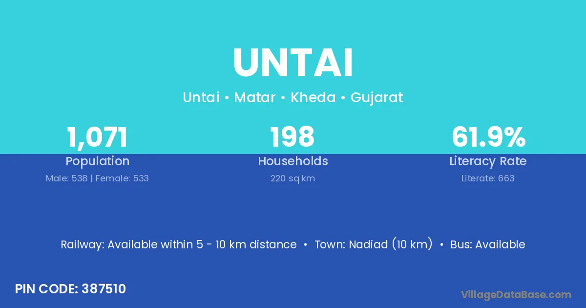 Nadiad (10 km) is the nearest town to Untai village for major economic activities and is located approximately 10 km away.