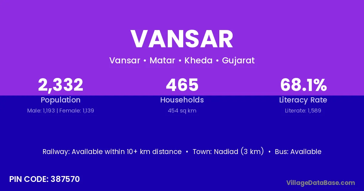 Nadiad (3 km) is the nearest town to Vansar village for major economic activities and is located approximately 3 km away.