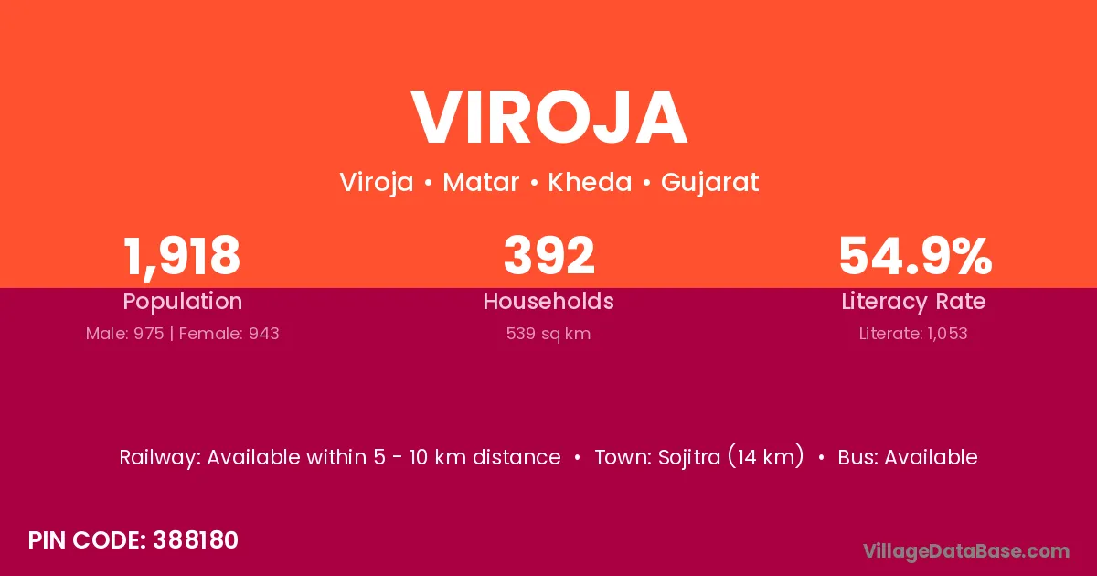 Sojitra (14 km) is the nearest town to Viroja village for major economic activities and is located approximately 14 km away.