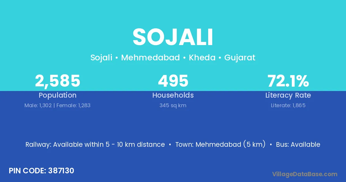 Mehmedabad (5 km) is the nearest town to Sojali village for major economic activities and is located approximately 5 km away.