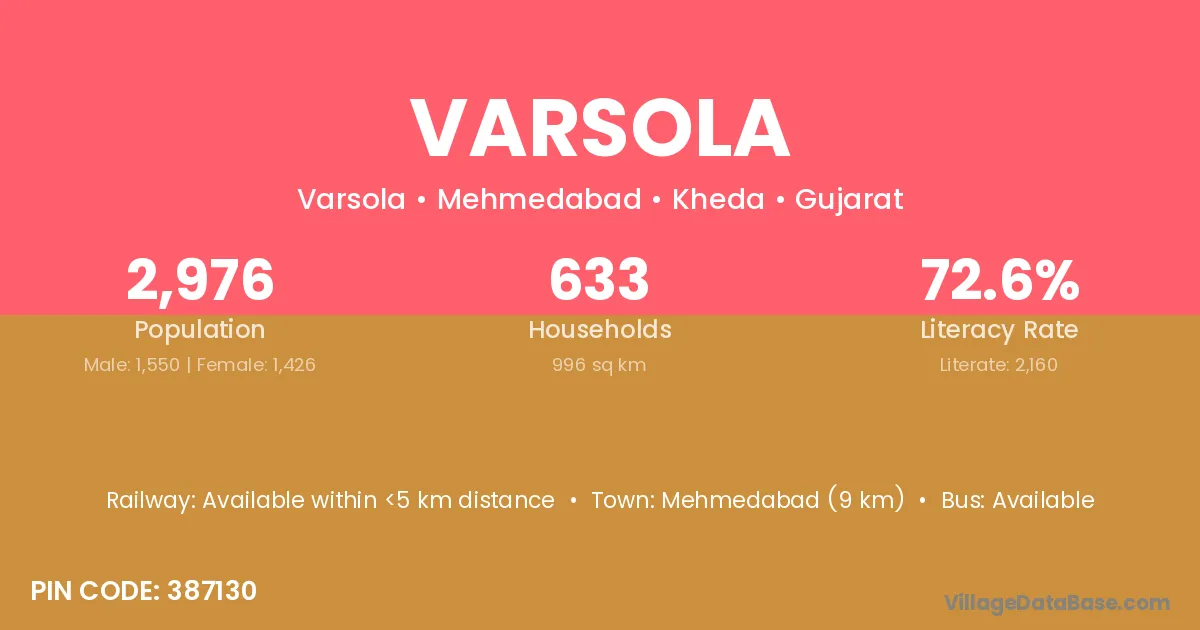 Mehmedabad (9 km) is the nearest town to Varsola village for major economic activities and is located approximately 9 km away.