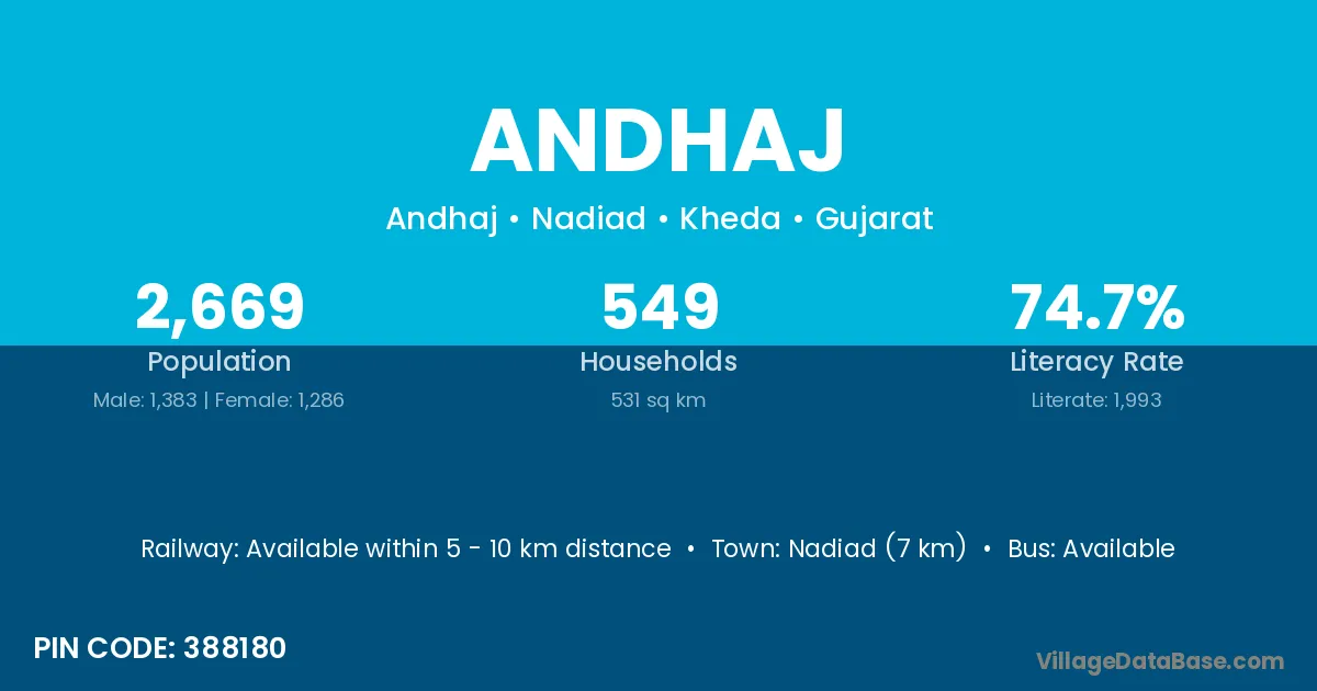 Nadiad (7 km) is the nearest town to Andhaj village for major economic activities and is located approximately 7 km away.
