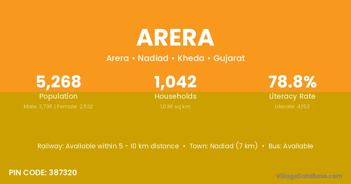 Nadiad (7 km) is the nearest town to Arera village for major economic activities and is located approximately 7 km away.