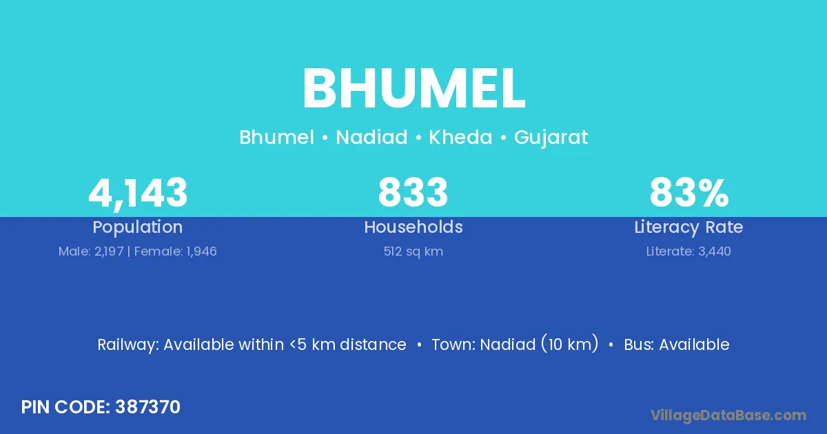 Nadiad (10 km) is the nearest town to Bhumel village for major economic activities and is located approximately 10 km away.