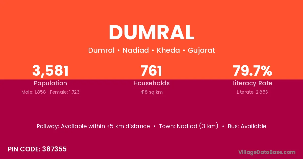 Nadiad (3 km) is the nearest town to Dumral village for major economic activities and is located approximately 3 km away.