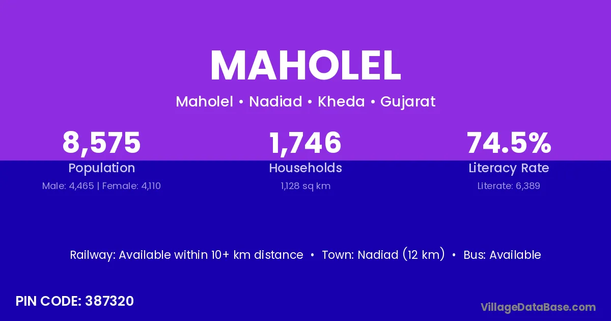 Nadiad (12 km) is the nearest town to Maholel village for major economic activities and is located approximately 12 km away.