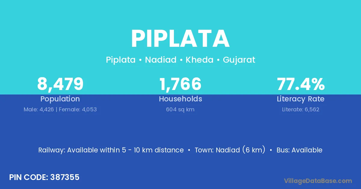 Nadiad (6 km) is the nearest town to Piplata village for major economic activities and is located approximately 6 km away.
