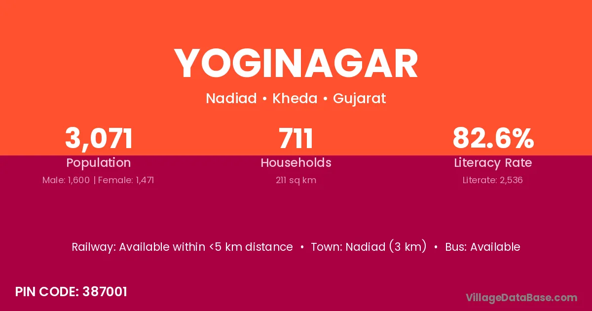 Nadiad (3 km) is the nearest town to Yoginagar village for major economic activities and is located approximately 3 km away.