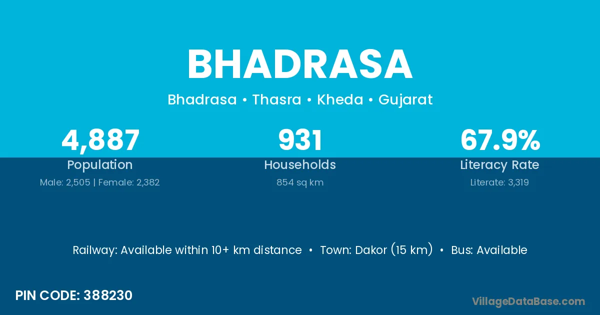 Dakor (15 km) is the nearest town to Bhadrasa village for major economic activities and is located approximately 15 km away.