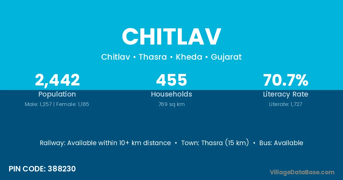 Thasra (15 km) is the nearest town to Chitlav village for major economic activities and is located approximately 15 km away.