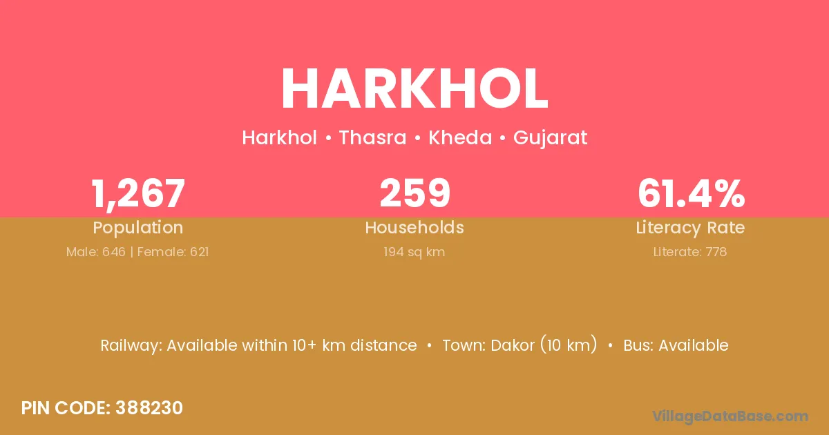 Dakor (10 km) is the nearest town to Harkhol village for major economic activities and is located approximately 10 km away.