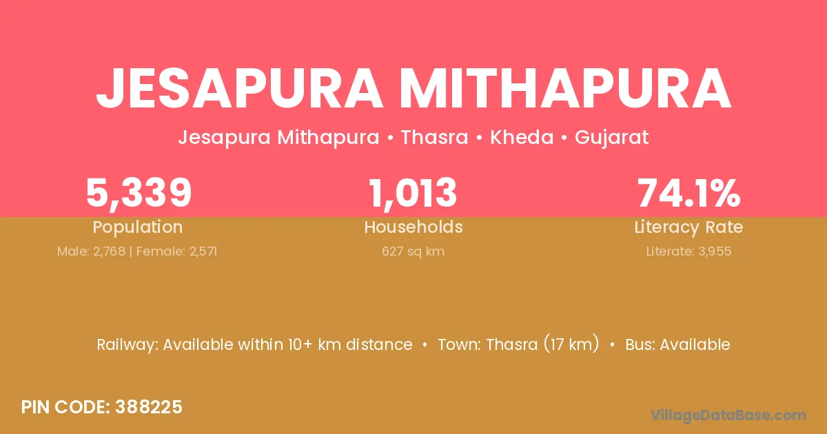 Thasra (17 km) is the nearest town to Jesapura Mithapura village for major economic activities and is located approximately 17 km away.