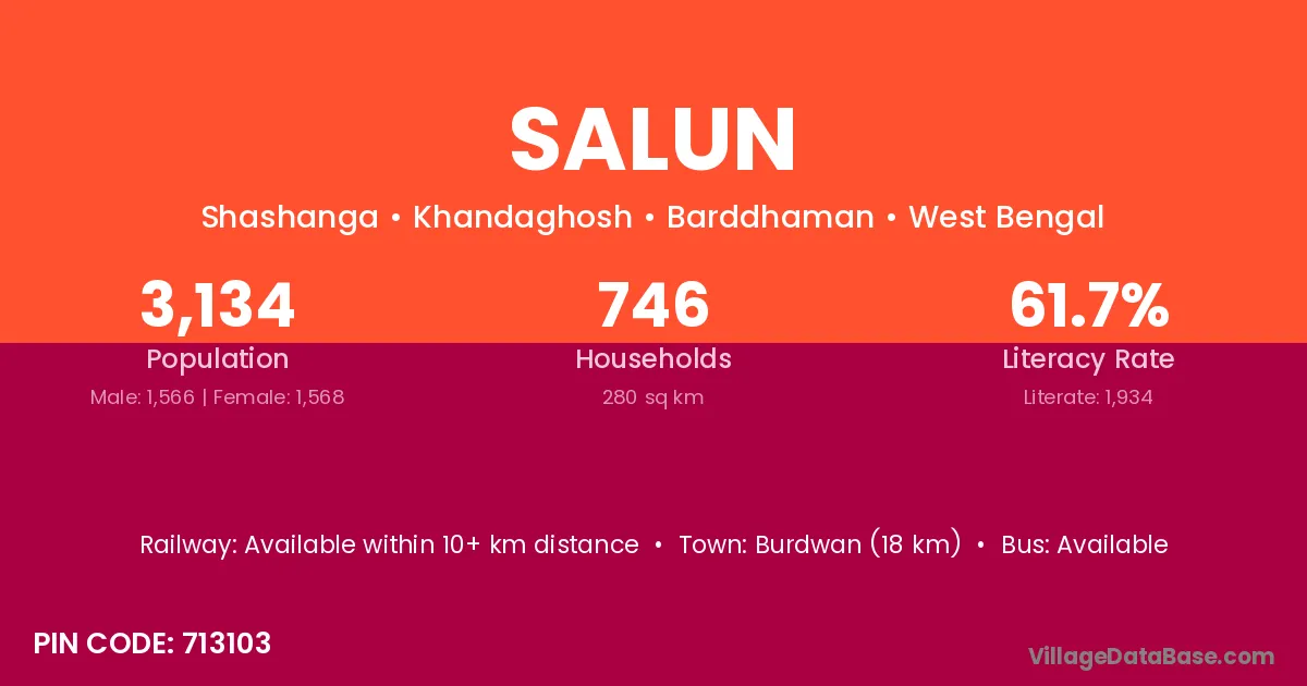 The literacy rate of Salun village is 72.70%. Male literacy stands at 80.30% and female literacy at 64.41%.