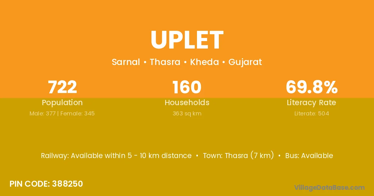 Thasra (7 km) is the nearest town to Uplet village for major economic activities and is located approximately 7 km away.