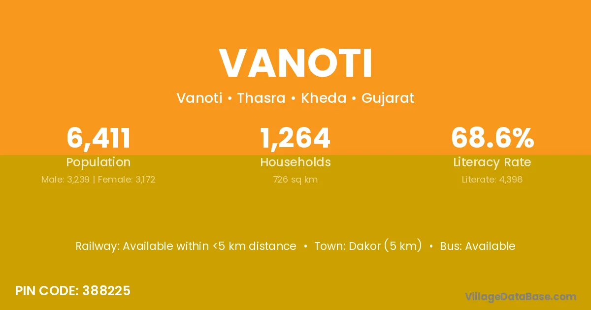 Dakor (5 km) is the nearest town to Vanoti village for major economic activities and is located approximately 5 km away.