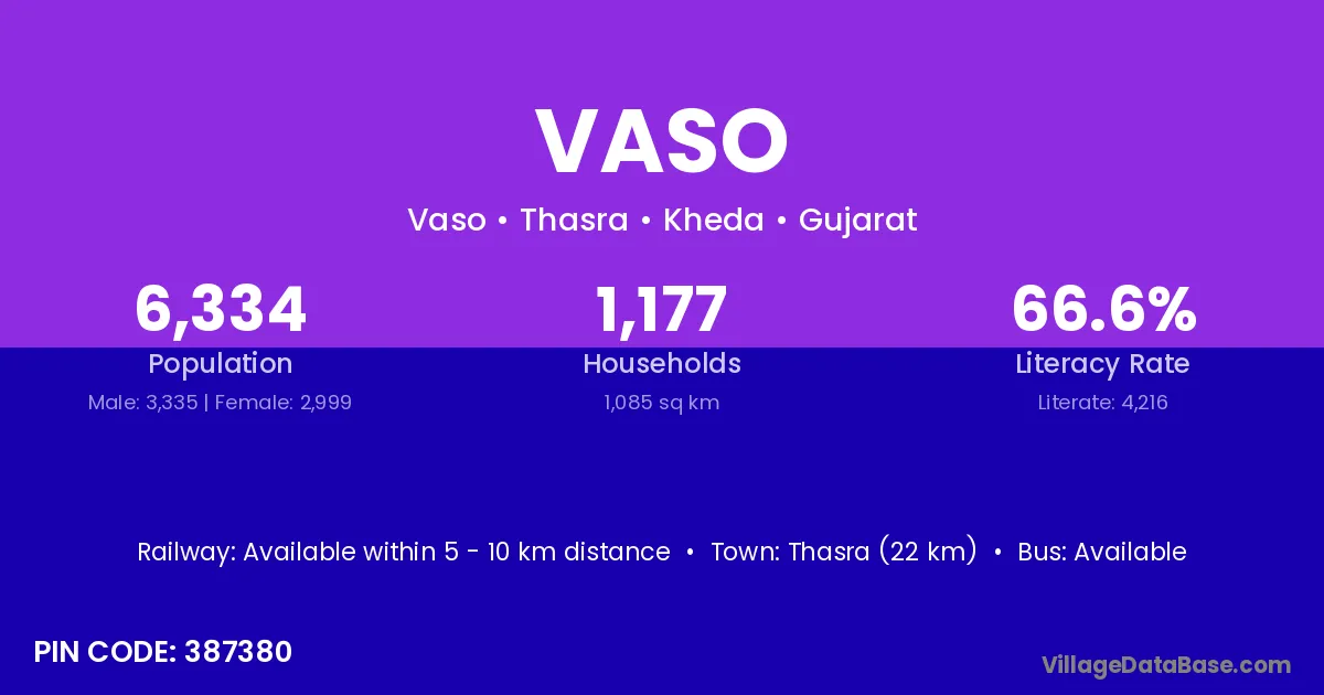 Thasra (22 km) is the nearest town to Vaso village for major economic activities and is located approximately 22 km away.