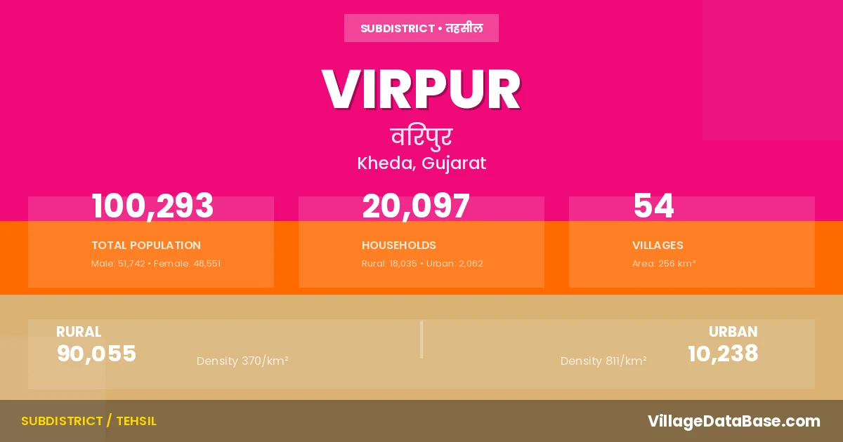 According to the 2011 census The total area of Virpur Taluka is 256 km², with a population of 100293 people. The population density is 391 inhabitants per square kilometre, and there are approximately 20097 houses in the sub district.