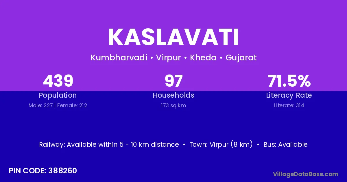 Virpur (8 km) is the nearest town to Kaslavati village for major economic activities and is located approximately 8 km away.