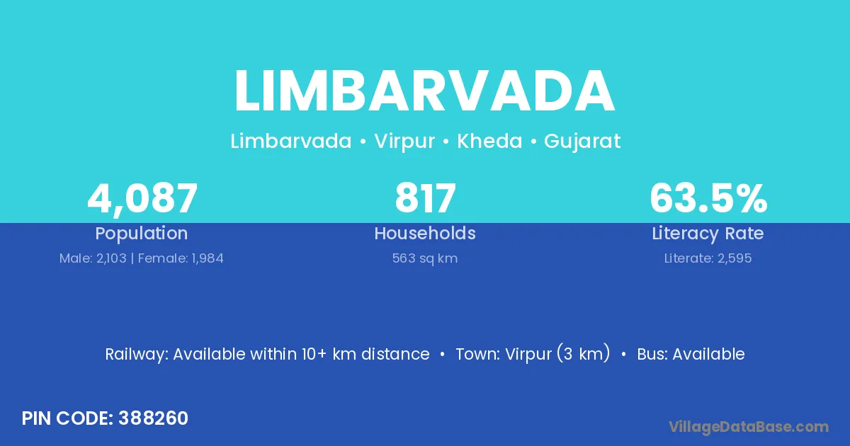 Virpur (3 km) is the nearest town to Limbarvada village for major economic activities and is located approximately 3 km away.