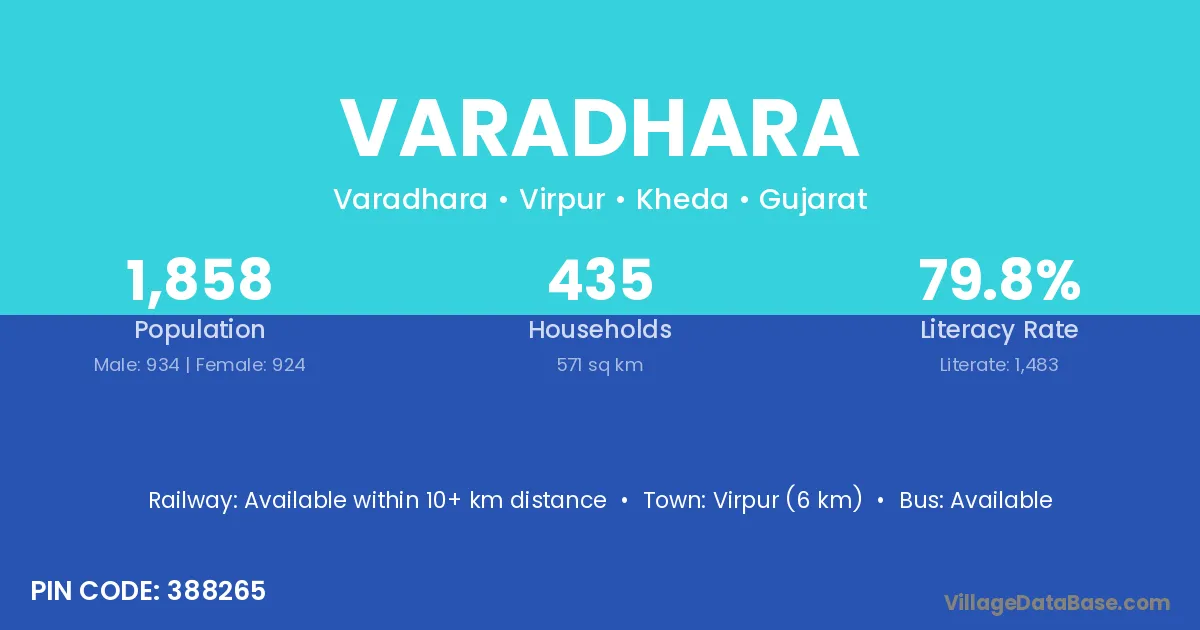 Virpur (6 km) is the nearest town to Varadhara village for major economic activities and is located approximately 6 km away.