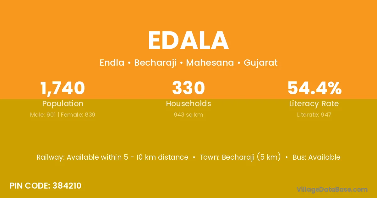 Becharaji (5 km) is the nearest town to Edala village for major economic activities and is located approximately 5 km away.