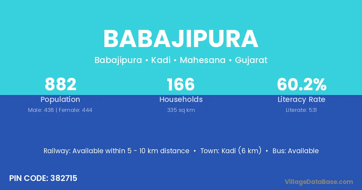 Kadi (6 km) is the nearest town to Babajipura village for major economic activities and is located approximately 6 km away.