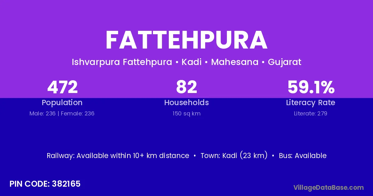 Kadi (23 km) is the nearest town to Fattehpura village for major economic activities and is located approximately 23 km away.