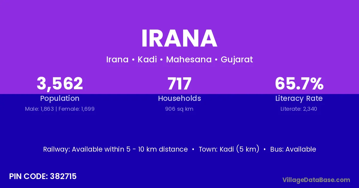 Kadi (5 km) is the nearest town to Irana village for major economic activities and is located approximately 5 km away.