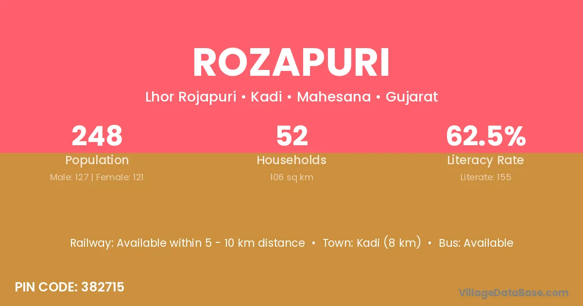 Kadi (8 km) is the nearest town to Rozapuri village for major economic activities and is located approximately 8 km away.