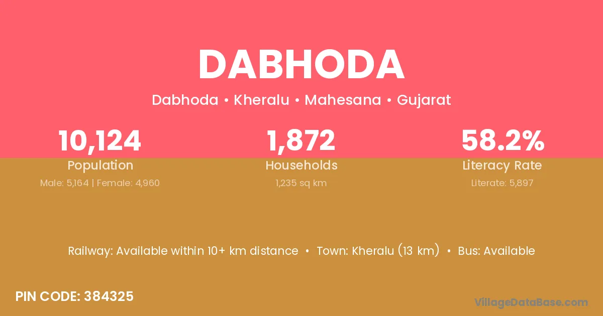 Kheralu (13 km) is the nearest town to Dabhoda village for major economic activities and is located approximately 13 km away.