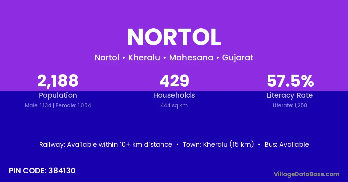 Kheralu (15 km) is the nearest town to Nortol village for major economic activities and is located approximately 15 km away.