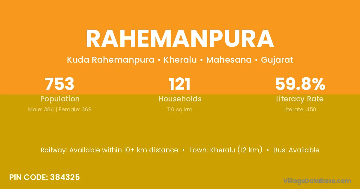 Kheralu (12 km) is the nearest town to Rahemanpura village for major economic activities and is located approximately 12 km away.