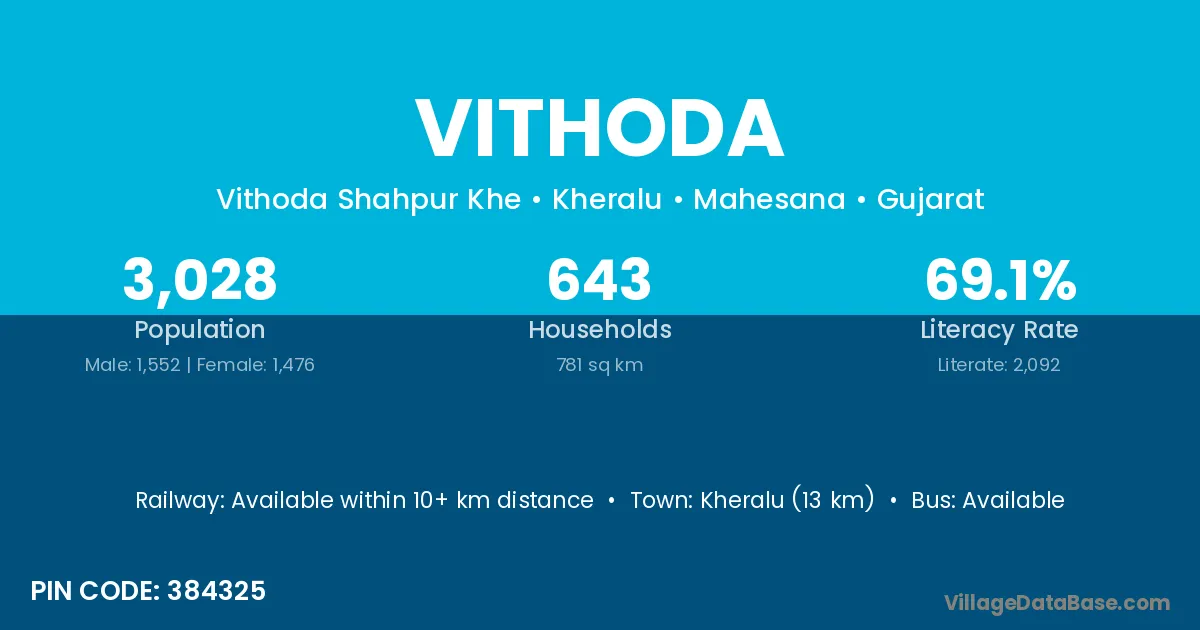 Kheralu (13 km) is the nearest town to Vithoda village for major economic activities and is located approximately 13 km away.