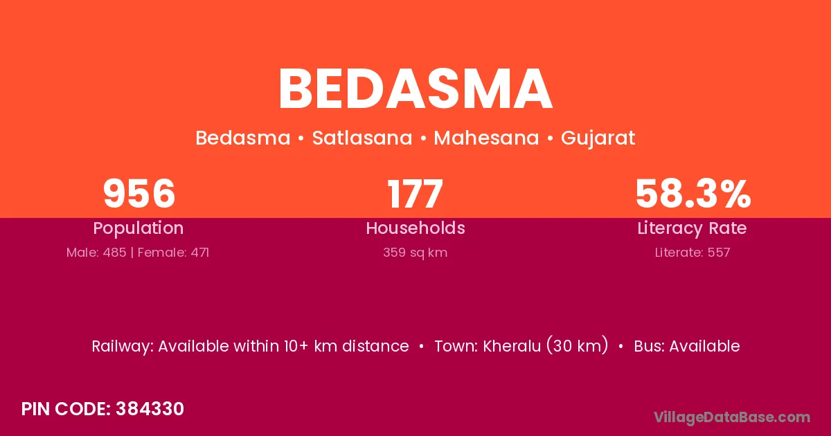 Kheralu (30 km) is the nearest town to Bedasma village for major economic activities and is located approximately 30 km away.