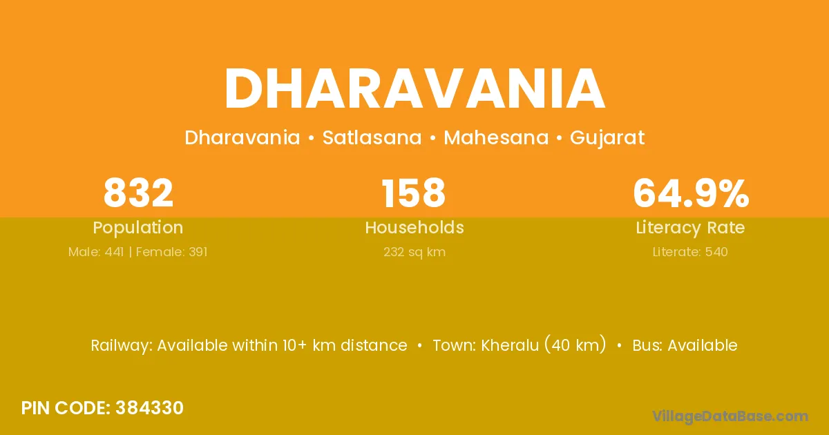 Kheralu (40 km) is the nearest town to Dharavania village for major economic activities and is located approximately 40 km away.