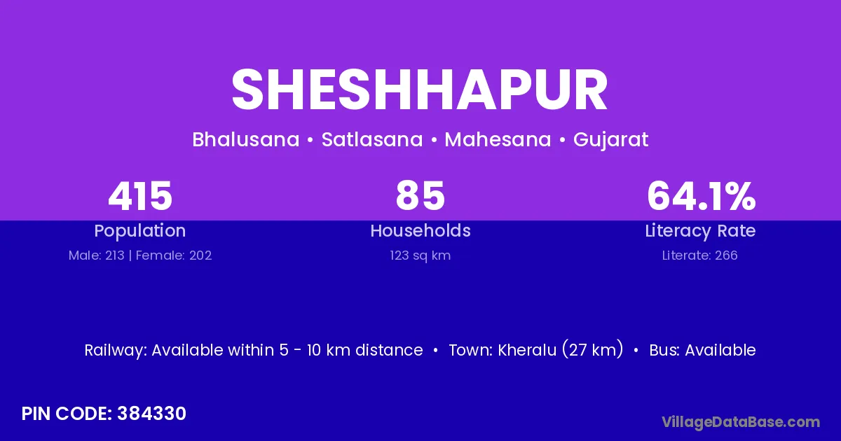 Kheralu (27 km) is the nearest town to Sheshhapur village for major economic activities and is located approximately 27 km away.