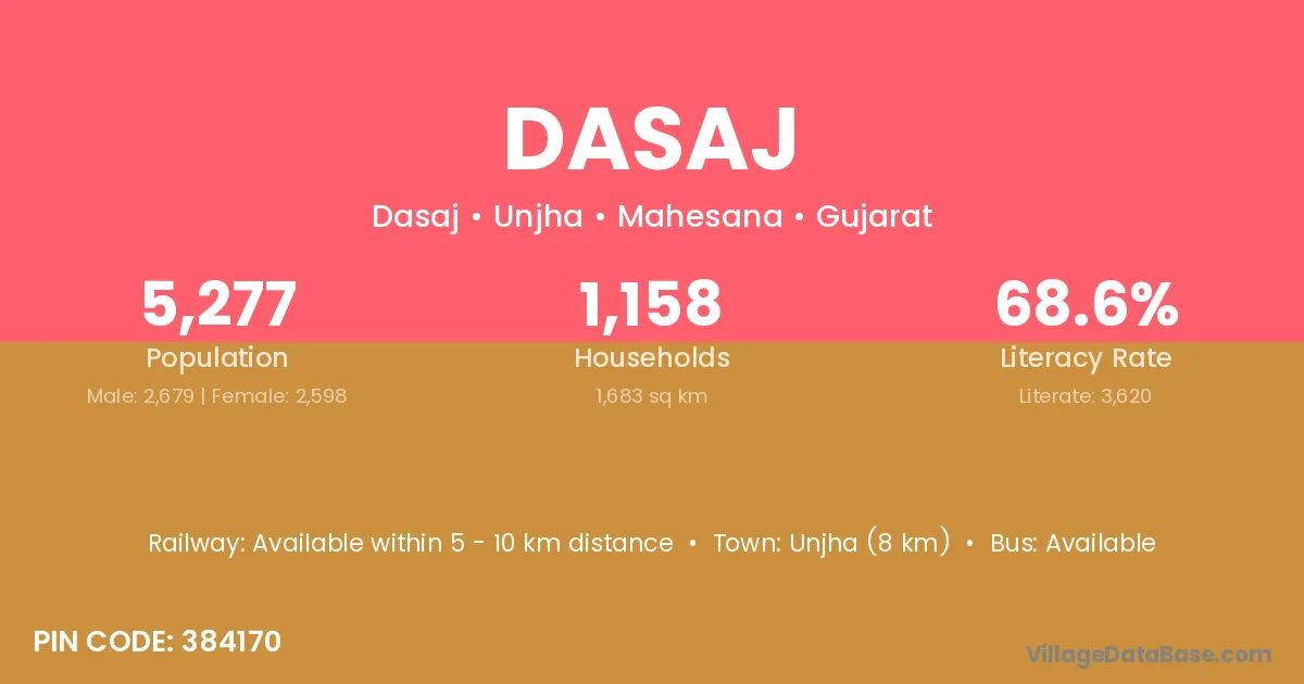 Unjha (8 km) is the nearest town to Dasaj village for major economic activities and is located approximately 8 km away.