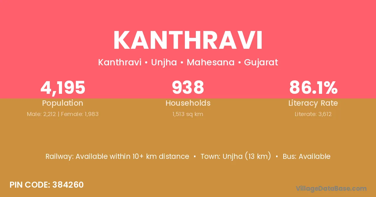 Unjha (13 km) is the nearest town to Kanthravi village for major economic activities and is located approximately 13 km away.